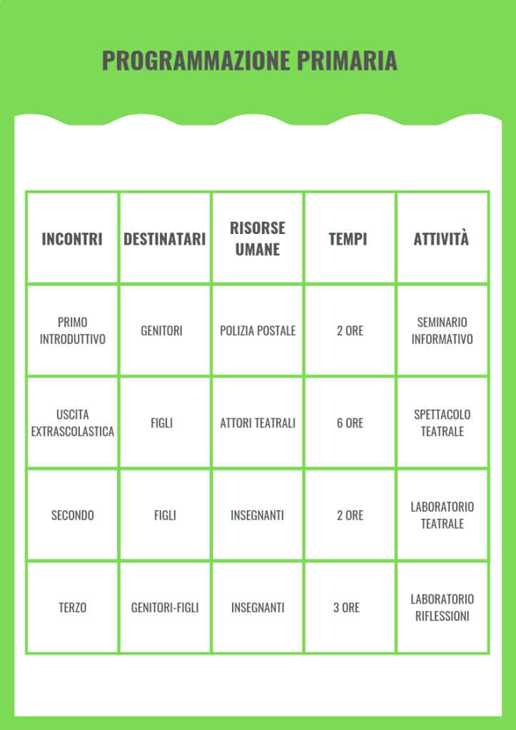 Il progetto si articola in azioni rivolte a due diversi target: principalmente ai genitori in co-partecipazione degli alunni delle classi V della primaria e delle classi I della secondaria di primo grado . Nasce con lo scopo di sostenere e aiutare le famiglie a stabilire un dialogo con i propri figli nell’era digitale. Il percorso si articolerà in incontri con i genitori e i figli, dibattiti aperti per poter affrontare le tematiche del progetto con esperti quali enti e insegnanti. Lo scopo è quello di realizzare un vero e proprio canale informativo e comunicativo tra genitori e genitori e figli. Il progetto sarà prima di tutto incentrato sul tema della relazione genitori/ figli, sulla logica del contratto e si concentrerà in seguito sul contesto tecnologico.